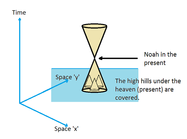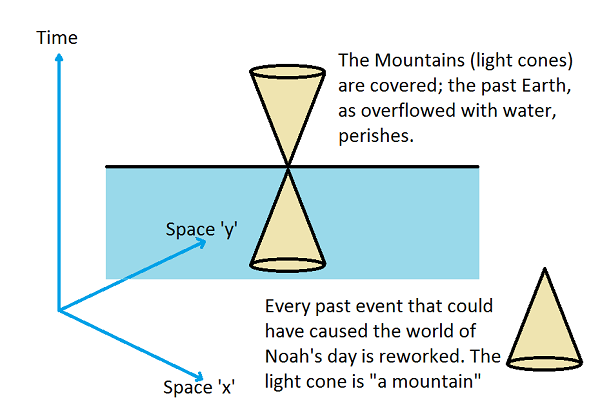 We can only imagine the rising waters (the past) coming within 15 forearms' lengths of the "present": being half the height of the ark. But "up" in our space time diagram was merely the time axis and not the x, y or z axis; so the "past" properly put, encroached within half the (distance of the) time of the ark. (The only remaining "present" was in or about the ark, and so how could it possibly be that the ark was half in the present and half out? - Then was it in the future?)