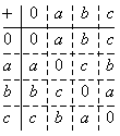 Where the elements a = (0,1), b = (1,0), c = (1,1) are as in the table and the identity element 0 = (0,0). We simply note that aside from use of the identity element, each sum of two different elements is equal to the remaining one of the three. An element added to itself is 0, the identity, and of course 0 + x = x as usual.