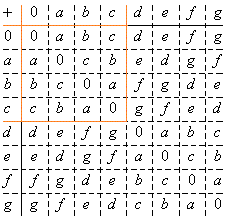 Note the embedded K4 subgroup within the red lines. There are seven such K4 subgroups in the octal group above, formed from the identity element with the triples [a,b,c], [a,d,e], [a,f,g], [b,d,f], [b,e,g], [c,e,f], [c,d,g] under closed addition. (There are also seven order two subgroups formed of zero and each of the seven singletons, [0,a].[0,b],[0,c], etc...)